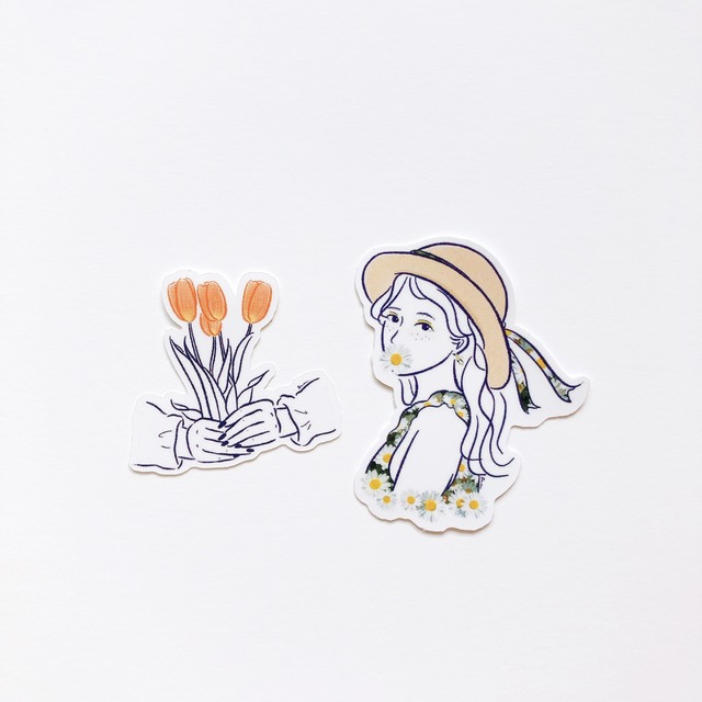 スマホに挟めるサイズのステッカー 【Tulips】 マットなステッカー、再剥離加工あり。 貼り付け後、綺麗に剥がせる粘着シートです。 参考サイズ : 49mm×45mm 【Daisy】 ユポ紙、光沢加工あり。 耐水性がある、貼って剥がせるステッカー。 参考サイズ : 51mm×60mm ※写り方により、 若干色味が異なって見える場合がございます。 ◎グッズをご購入の方に、 個展オリジナルポストカードをプレゼント! (イラストオーダー等に利用できるクーポン付) ▼配送について 配送方法は以下より選択可能です。 ・スマートレター (追跡不可) ・ヤマト宅急便 / ネコポス (追跡可) ▼送料 ・スマートレター : 180円 ・ヤマト宅急便 / ネコポス : 330円 ご入金確認後、1週間以内を目処に発送致します。 *This item is for domestic delivery only. It cannot be shipped overseas.